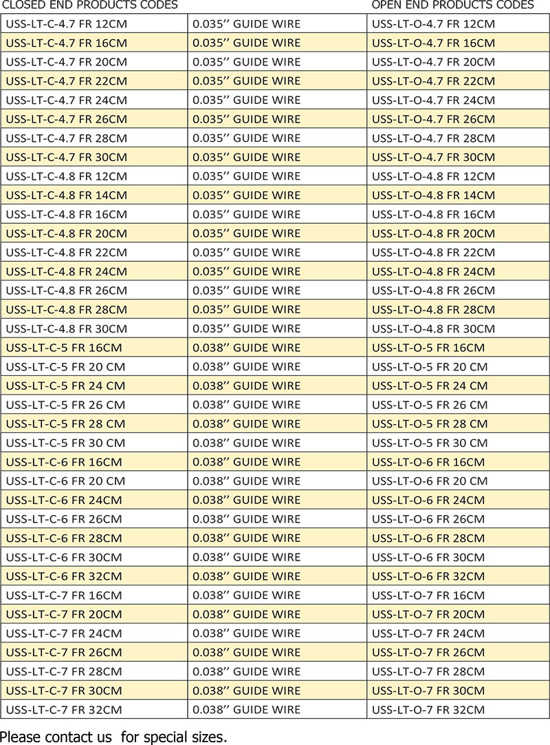 Sizes (in Fr): 3, 4, 4.5, 4.7, 4.8, 5, 6, 7